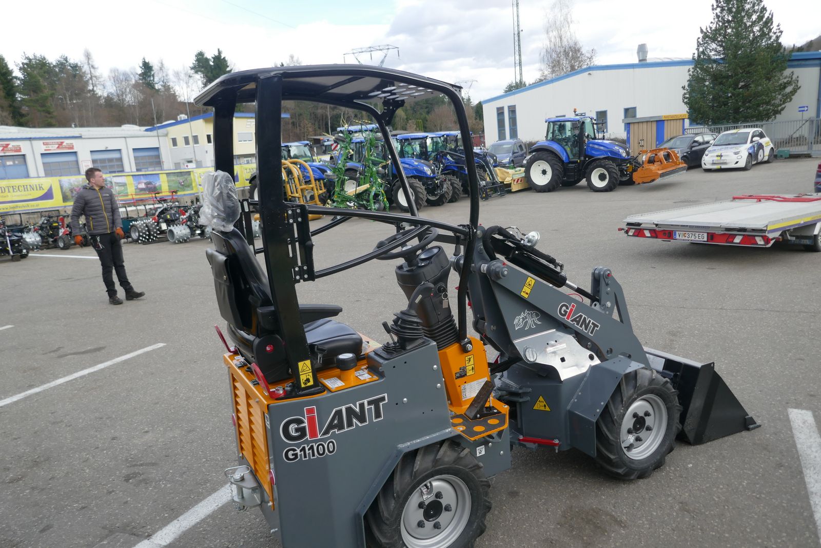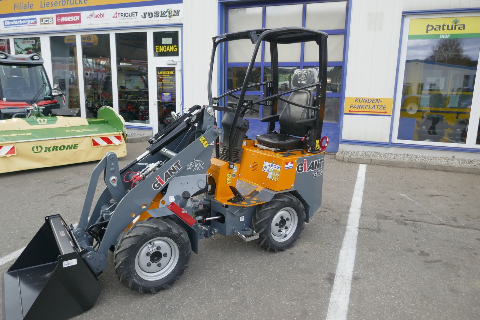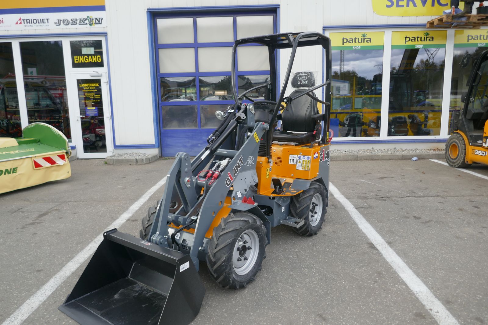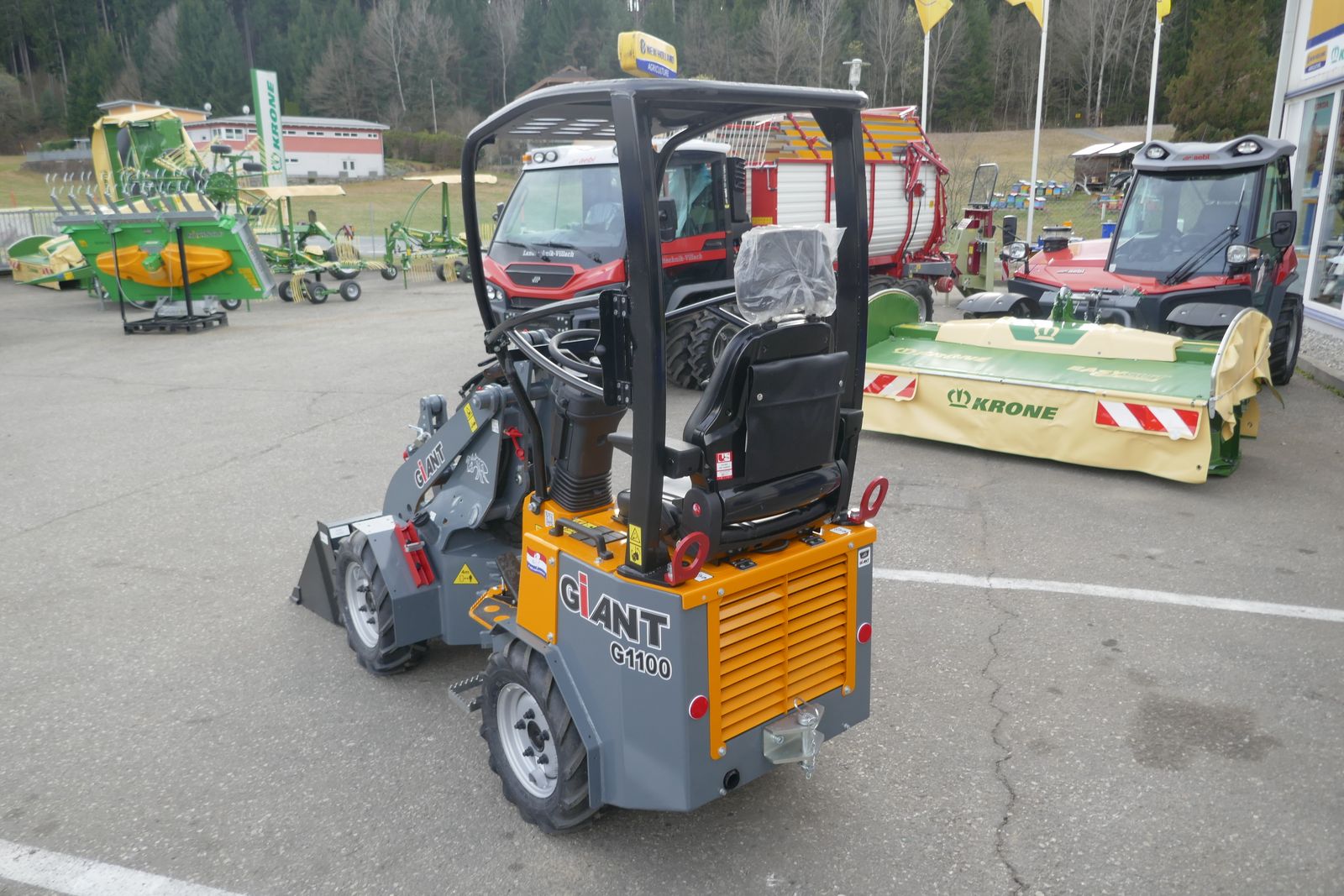 Giant G 1100 mit Kubota Motor, 20 PS, Hydrostat mit Joystick Steuerung, Bereifung 23x8.50-12 AS, Giant Compact Werkzeugaufnahme mit 3. Linie, Schaufel 90 cm, Rangierkupplung, ROPS Fahrerschutzdach mit Sicherheitstür links und rechts, Arbeitsscheinwerfer am Kabinenrahmen, Fahrzeugbreite 93 cm, Batteriehauptschalter, Standort: Lieserbrücke.