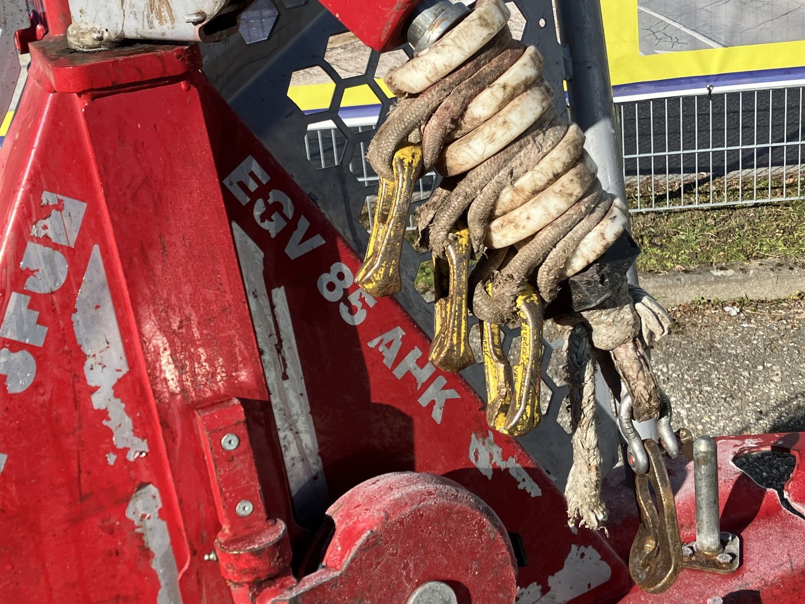 Tajfun EGV 85, 8,5 t Funkseilwinde mit oberer und unterer Seileinlaufrolle, Kunststoff-Seil mit Parallelhaken, Seilgleiter, Anhängevorrichtung, Schildbreite: 205 cm, Schutzgitter, sofort verfügbar.