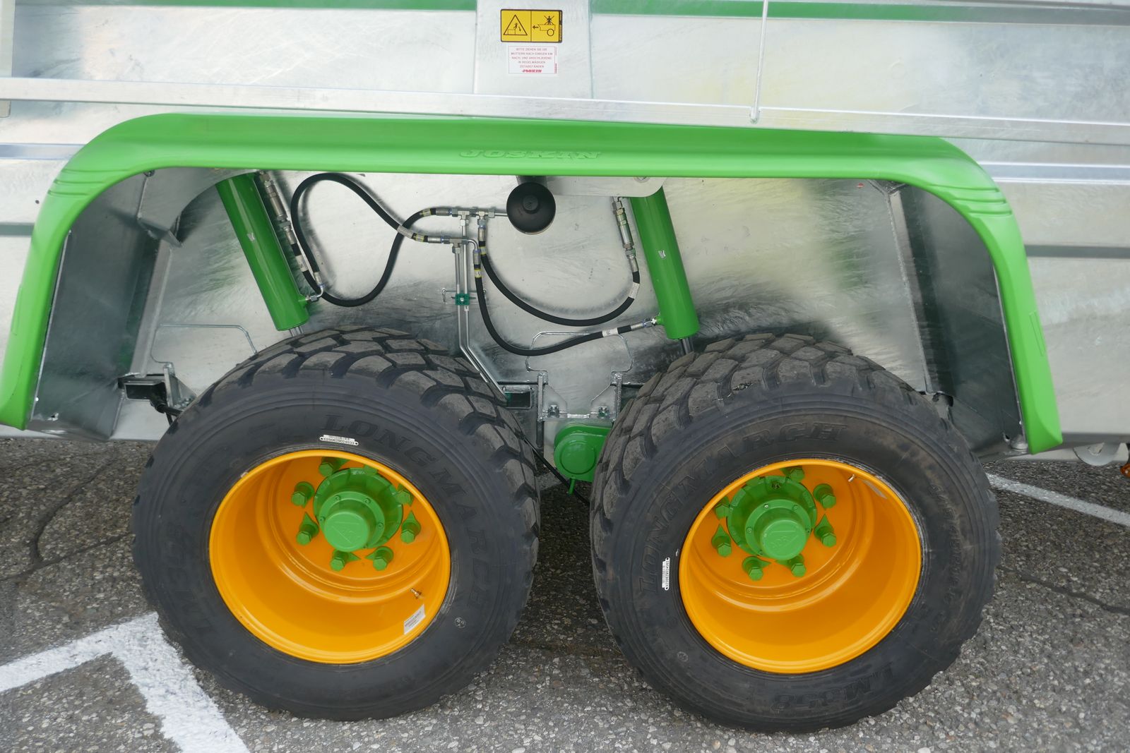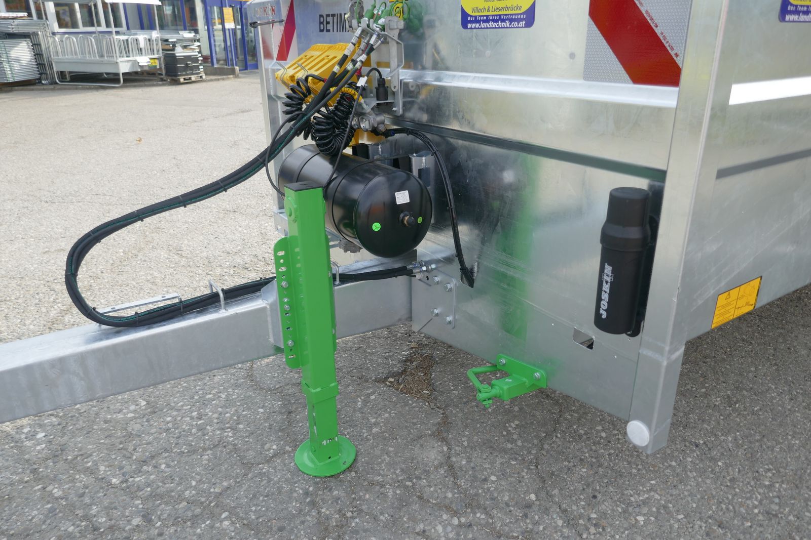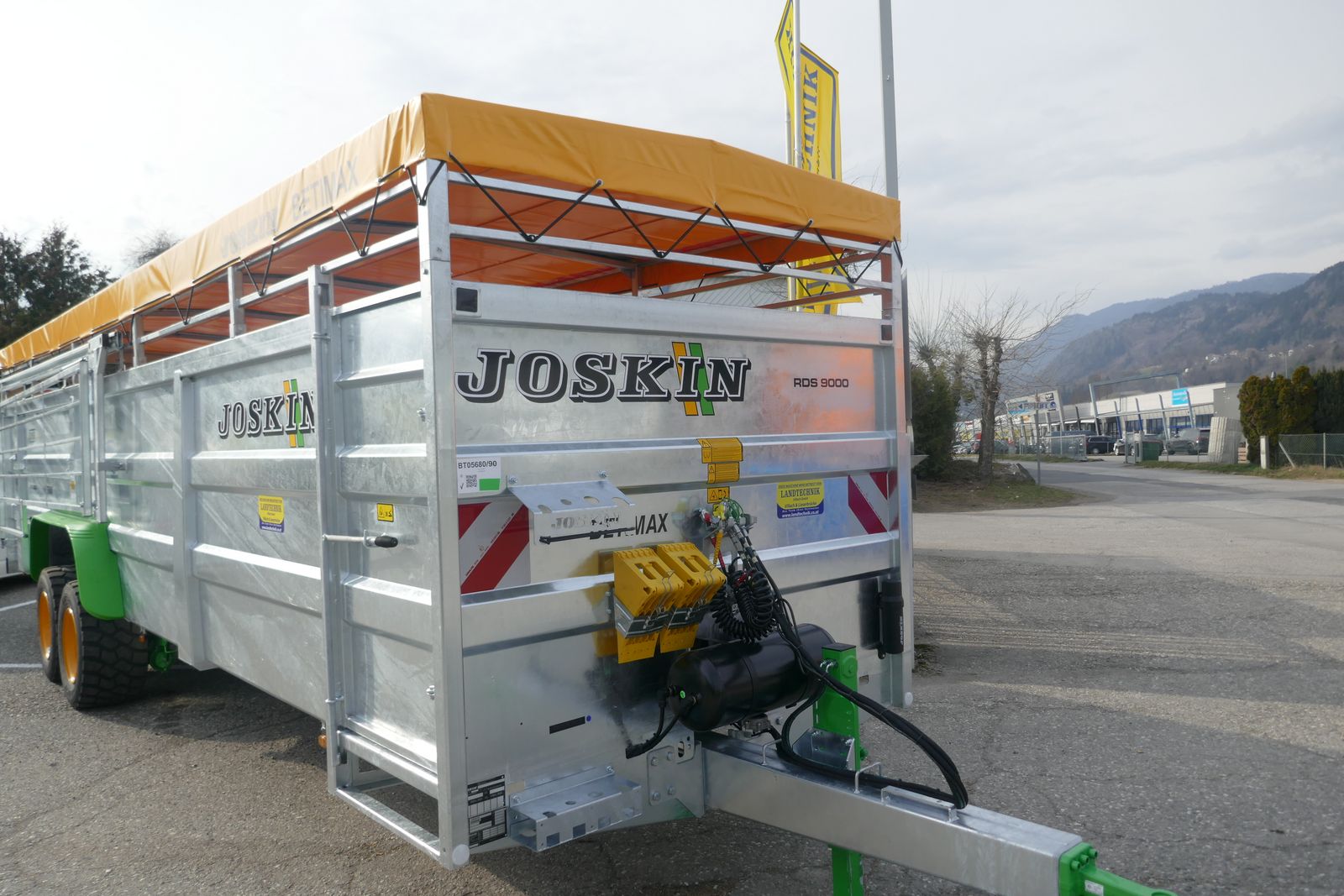 Joskin Viehanhänger RDS 9000, hydraulisch absenkbar, mit Tandemachse, vollverzinkte Ausführung mit Kunstharzboden, einteilige innere Trennwand mit 3 Einstellmöglichkeiten, feuerverzinkte und selbsttragende Seitengitter von 3,5 m auf Führungsschiene auf Federung, Bereifung 445/45R19,5 mit Druckluftbremse, mit Kunststoffkotflügel, vordere Einstiegstür, Dachplane, Doppeltür hinten, Beleuchtung, hydraulischer Stützfuß, 25 km/h COC-Papier, ideal für das Tierwohl und Langlebigkeit, Lieferung frei Haus in Österreich!