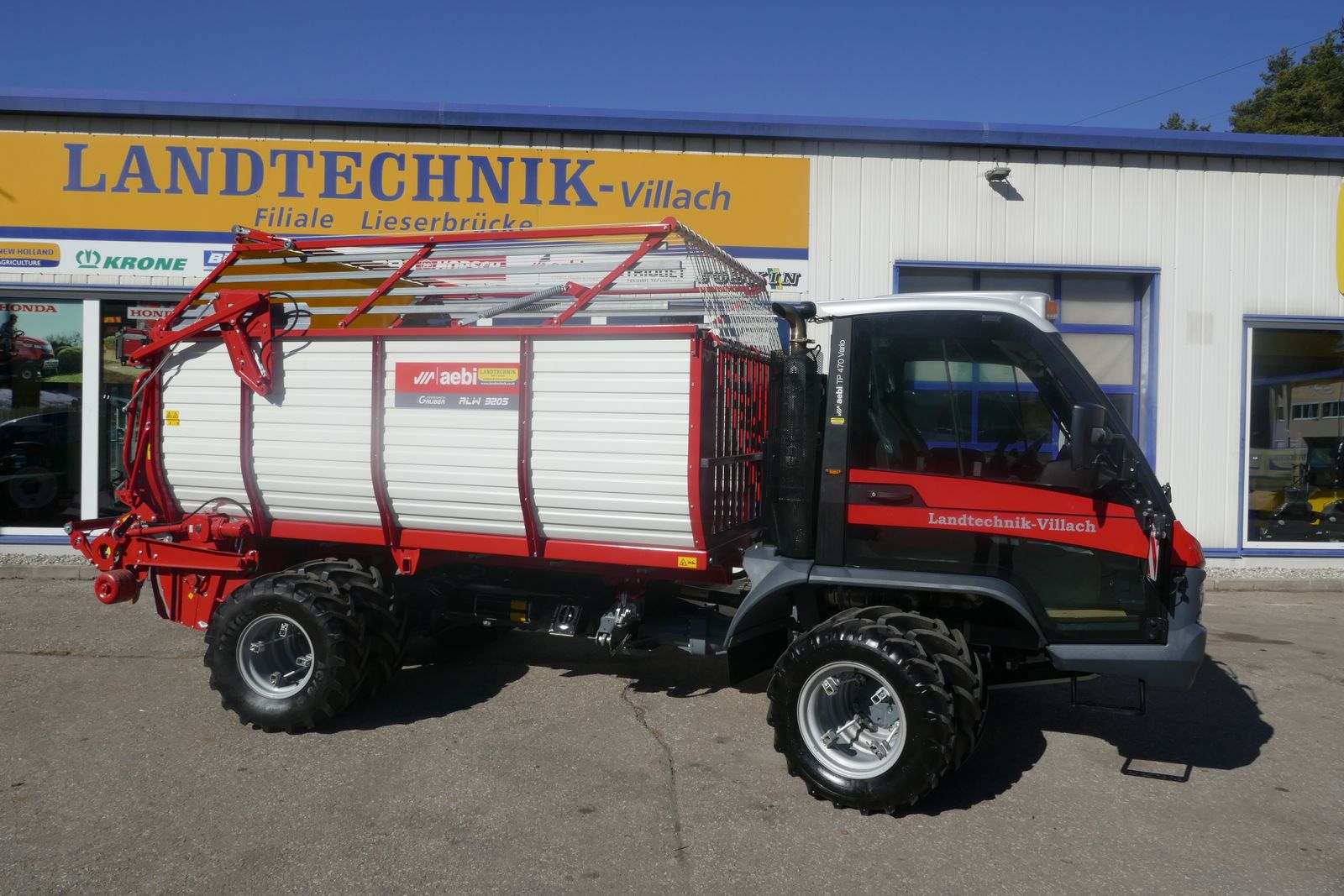 Aebi TP 470 Vario Transporter, mit 136 PS, gefedertes Fahrwerk, 50 km/h Ausführung, 4-Rad-Lenkung, Radstand 3,25 m, 10 t Gesamtgewicht, Bereifung: 425/55R 17 AS, komfortable Luxuskabine mit Klimaautomatik, gefederter Luftsitz, Fahrhebel integriert in der Armlehne, mit Gruber Kurzschnitt Ladewagen ALW 320S-Lang, automatische Kettenschmierung, mit Zwillingsrädern, mit Rückfahrkamera, mit 12-Zoll-Display integriert, Vorführmaschine, Standort Lieserbrücke, prompt verfügbar.