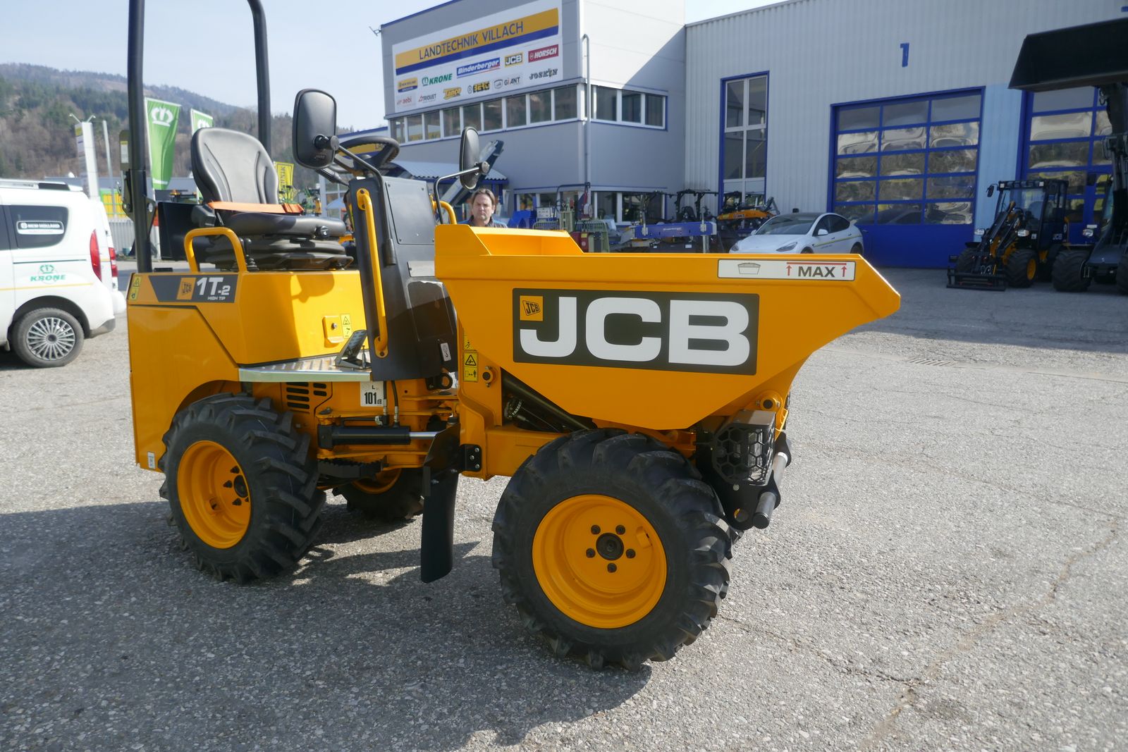 JCB Raddumper mit Perkinsmotor, 1000 kg Nutzlast, Hydrostatischer Antrieb mit einzelene Radmotoren, Rückfahr alarm, Fahrersitz mit Sicherheitsgurt, Rundumleuchte, Schutzbügel an der Lenkradsäule, Traktionsreifen 255/75-15,3, kappbarer ROPS-Rahmen, Beleuchtung, Funktionspaket Elektrik, Außenspiegel, Typisierung, Ausstellungsmaschine, prompt verfügbar.