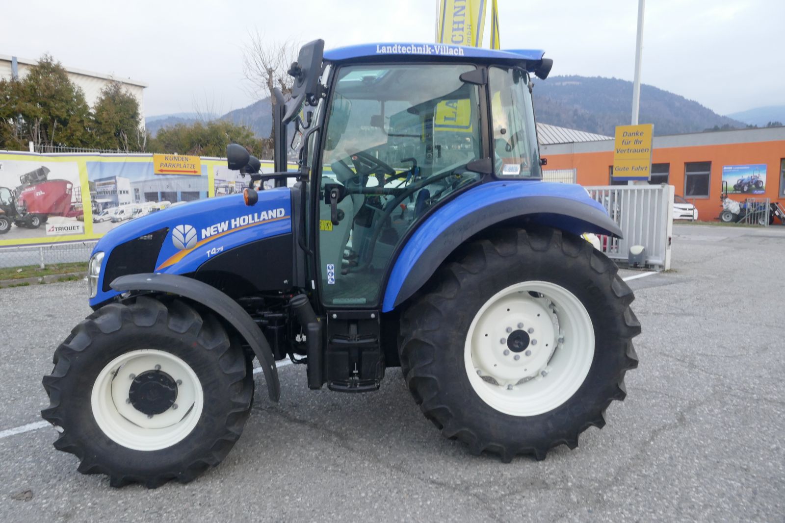 New Holland T4.75 mit 4 Zylinder, Powershuttle Getriebe, mit 40 km/h, mechanische Parkbremse, 2x DW DeLuxe Hecksteuergeräte, 2x DW Zwischenachssteuergeräte mit Joystick und Schalter für 3. Funktion, mechanische Hubwerksregelung mit Lift-O-Matic, hydraulisches Bremsventil, Komfortkabine mit Klimaanlage, Luftfedersitz, Beifahrersitz, Freisichtdachfenster, feste Frontscheibe, Lichtpaket, Radio, Wisch/Waschanlage für vorne und hinten, Kotflügel vorne mit schwenkend, Kotflügelverbreiterung hinten, hydr. Zapfwellenschaltung 540/540E, verstellbares Lenkrad, automatisches Anhängemaul, Bereifung: 380/70-20, 480/70-30, prompt lieferbar.