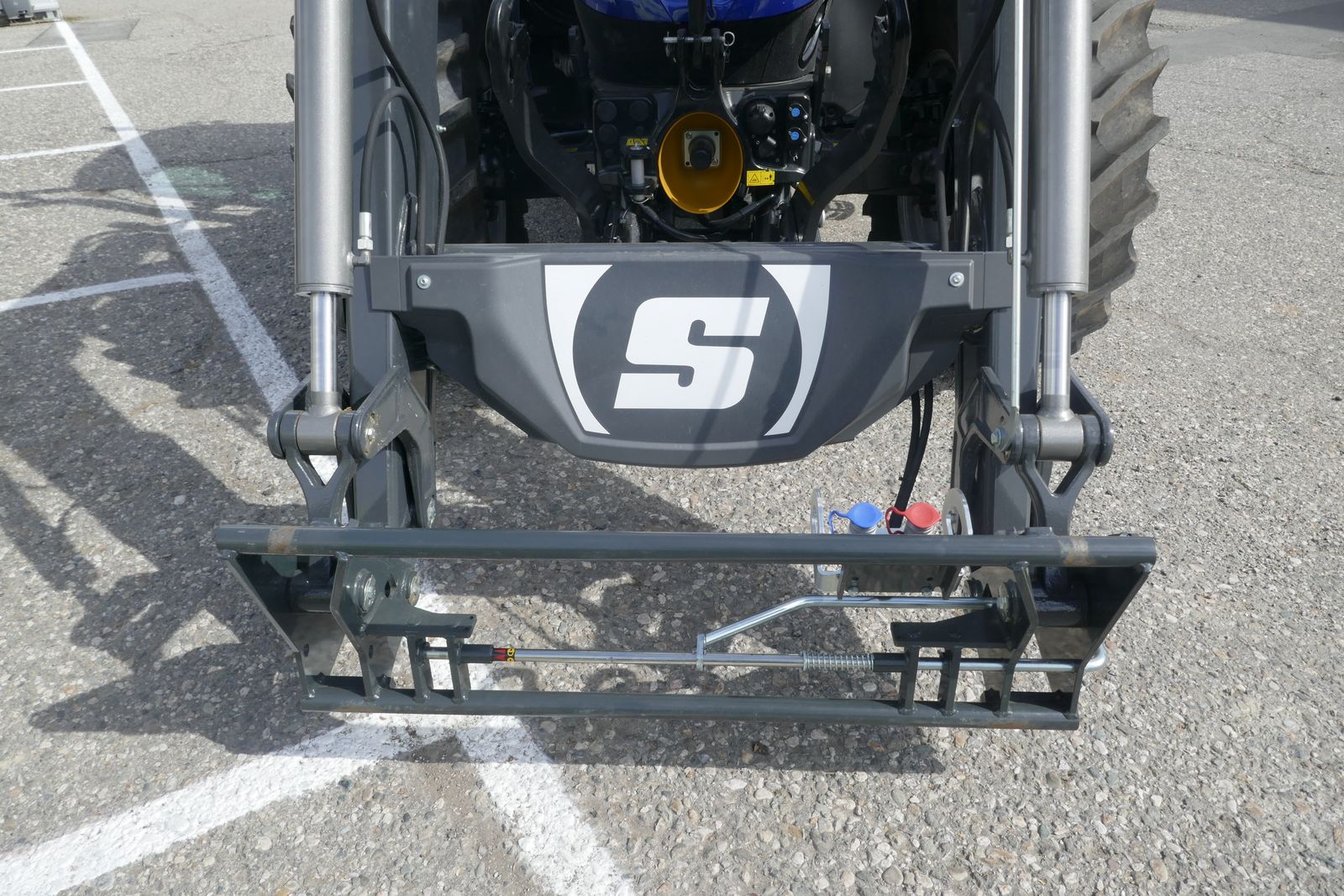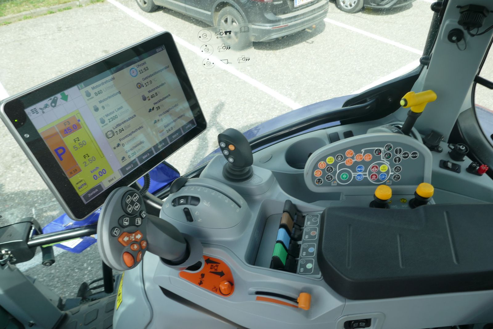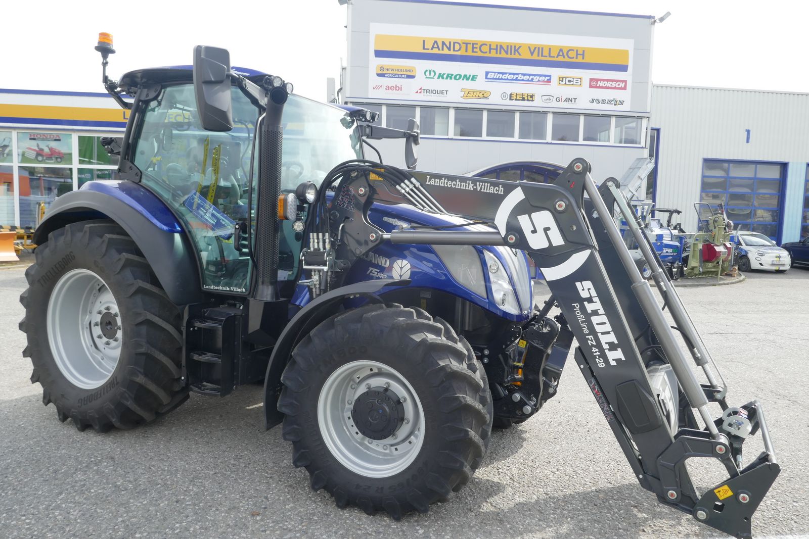 automatische Unterlenkerstabilisatoren, Druckluftbremse, druckloser Rücklauf, hydr. Oberlenker, gefederte SuperVision Niedrigkabine mit Panorama Fenster, Dachluke, Klimaautomatik, LED-Lichtpaket, 2 Rundumleuchten, Dynamic Comfort Sitz mit Heizung, Beifahrersitz, SideWinder Bedienarmlehne elektrisch verstellbar, IntelliView Monitor Plus, ISOBUS System, Vorbereitung für Lenksystem, Lederlenkrad, mit Stoll Frontlader FZ 41-29, mit innenliegender Paralellführung, Euro-Aufnahme, 3. Linie, ohne Werkzeug,