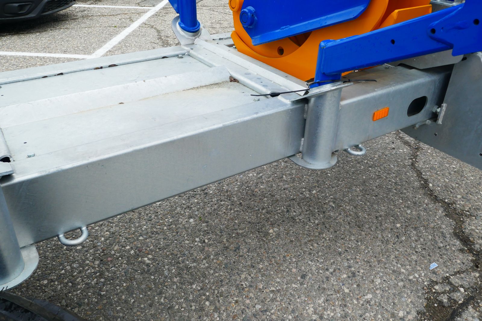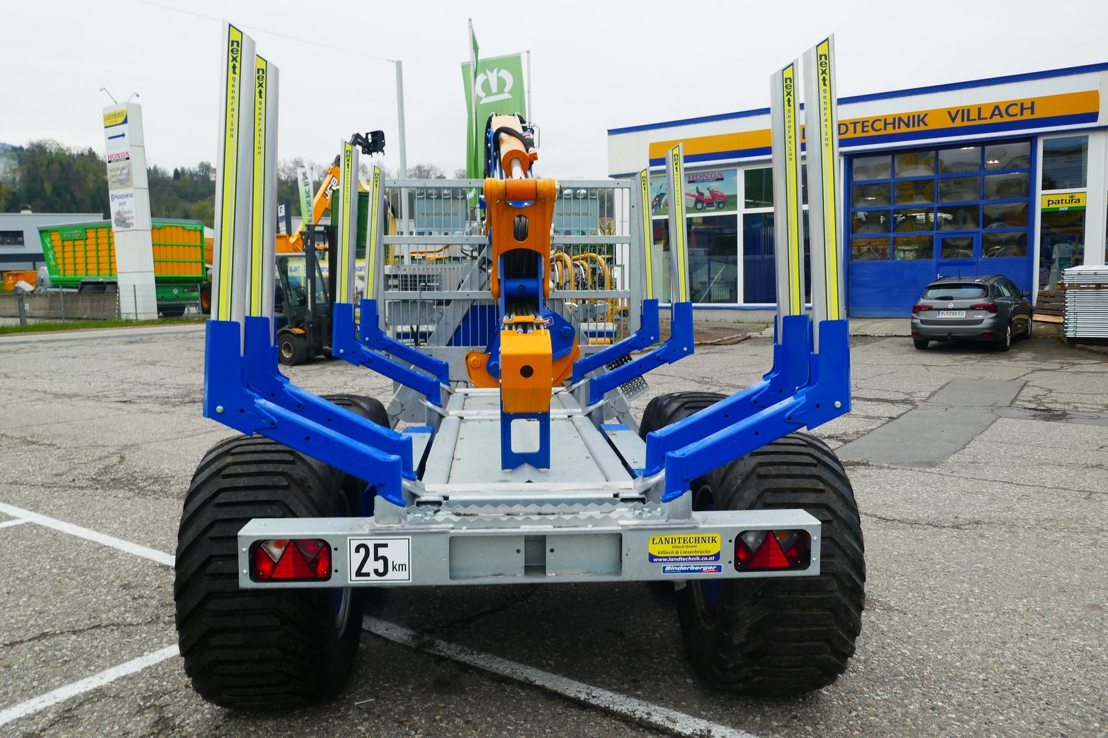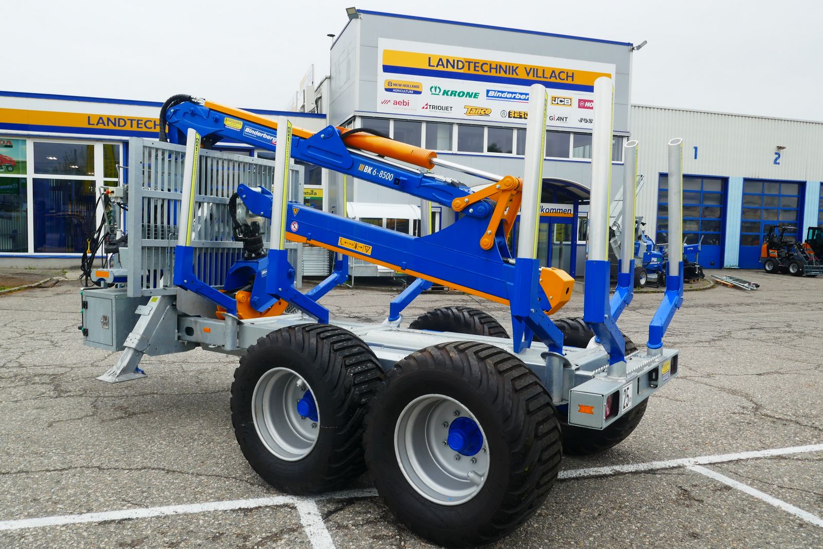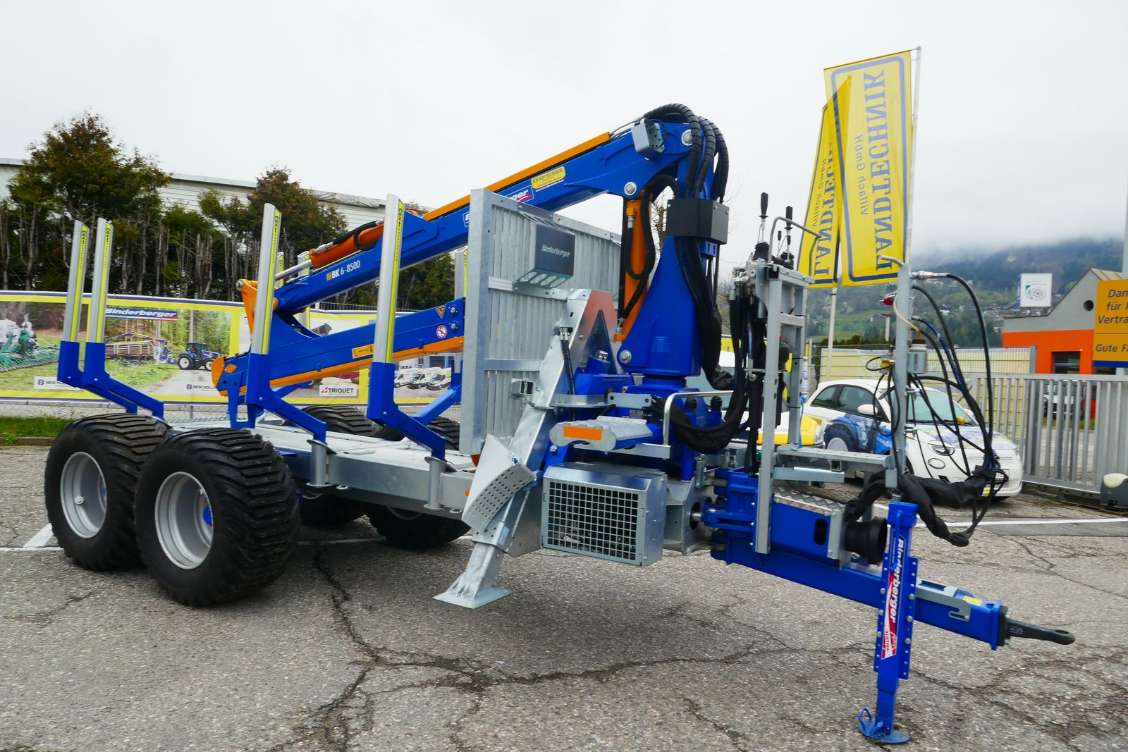 Kran BK 6 - 8500 mit Doppelteleausschub, mit A-Abstützung, inner Verlaucht, Rotator 5,5 t, Holzgreifer GZ 1400, Bedienung mit Stehpodest und Joystick und E-Bedienung, hydr. Eigenversorgung, mit Doppelzahnradpumpe, Ölkühler, 2 Kreis Druckluftbremse kombieniert mit Hydraulischerbremse, Bereifung: 550/45-22,5 PR 14, 8 Loch, hydraulische Lenkdeichsel mit Untenanhängung, 4. Rungenpaar, 2 Paar Rungenverlängerung mit Halterung, Felgen- und Ventilschutz, mit 2 LED Arbeitsscheinwerfer, 25 km/h Typisierung, Werkzeugkiste, mechanischer Stützfuß, verzinkter Anhänger mit Abdeckung für Steuerblock, prompt lieferbar.