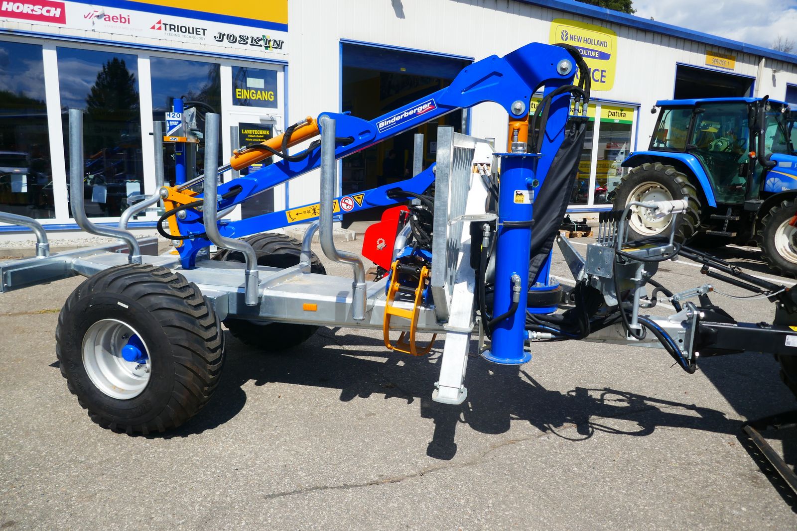 Binderberger Rückewagen RW 3, einachsig, Bereifung 400/60-15.5, mit Ventilschutz, mechanische Auflaufbremse, 4 Rungenpaare, Kran FK 4000 auf 3 m Auslage 500 kg Hubkraft, mit Forstzange, hydraulischen Rotator, Kran mit A-Abstützung und Steuerblock, Beleuchtung, 10 km/h Ausführung, für Kranbedienung 1 EW Steuergerät und Druckloser Rücklauf notwendig, weitere Optionen möglich, Lieferung nach Vereinbarung.