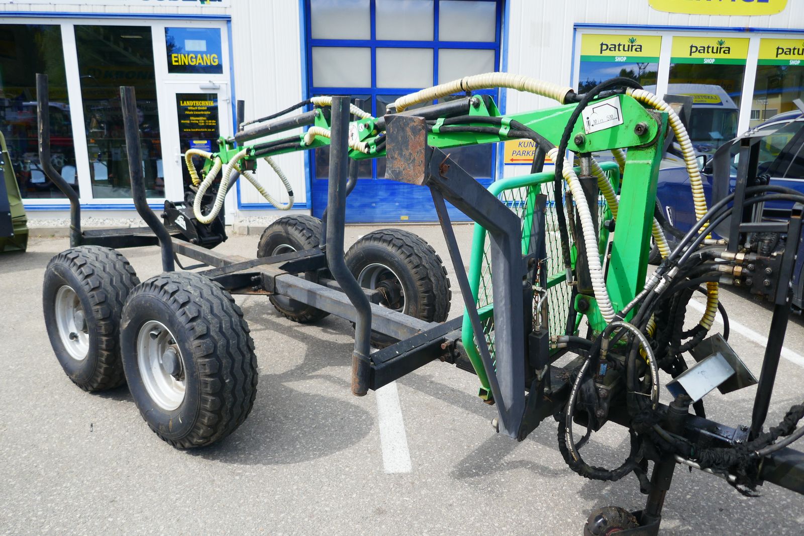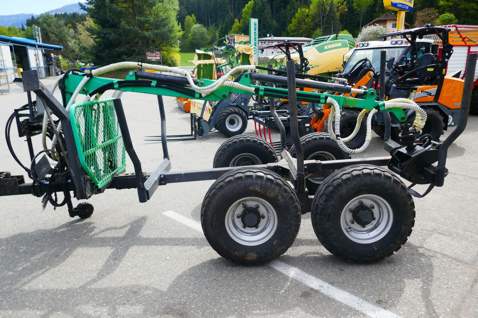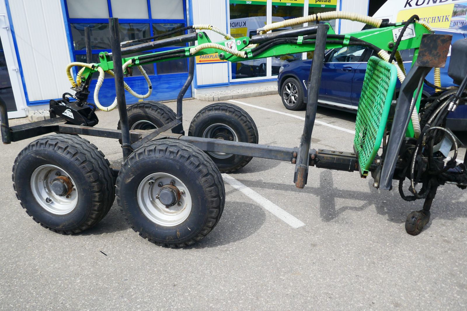 Forstanhänger 2 t leichte Ausführung mit Tandemachse, 3 Rungenpaare, Kran mit Teleskopausschub ca. 4 m und Rotator und Holzzange, mit hydraulischen Flapdown Abstützung, 1 EW Steuergerät und Druckloser Rücklauf erforderlich, ideales Fahrzeug für kleine Traktoren, Stützrad, Standort: Lieserbrücke, prompt verfügbar.