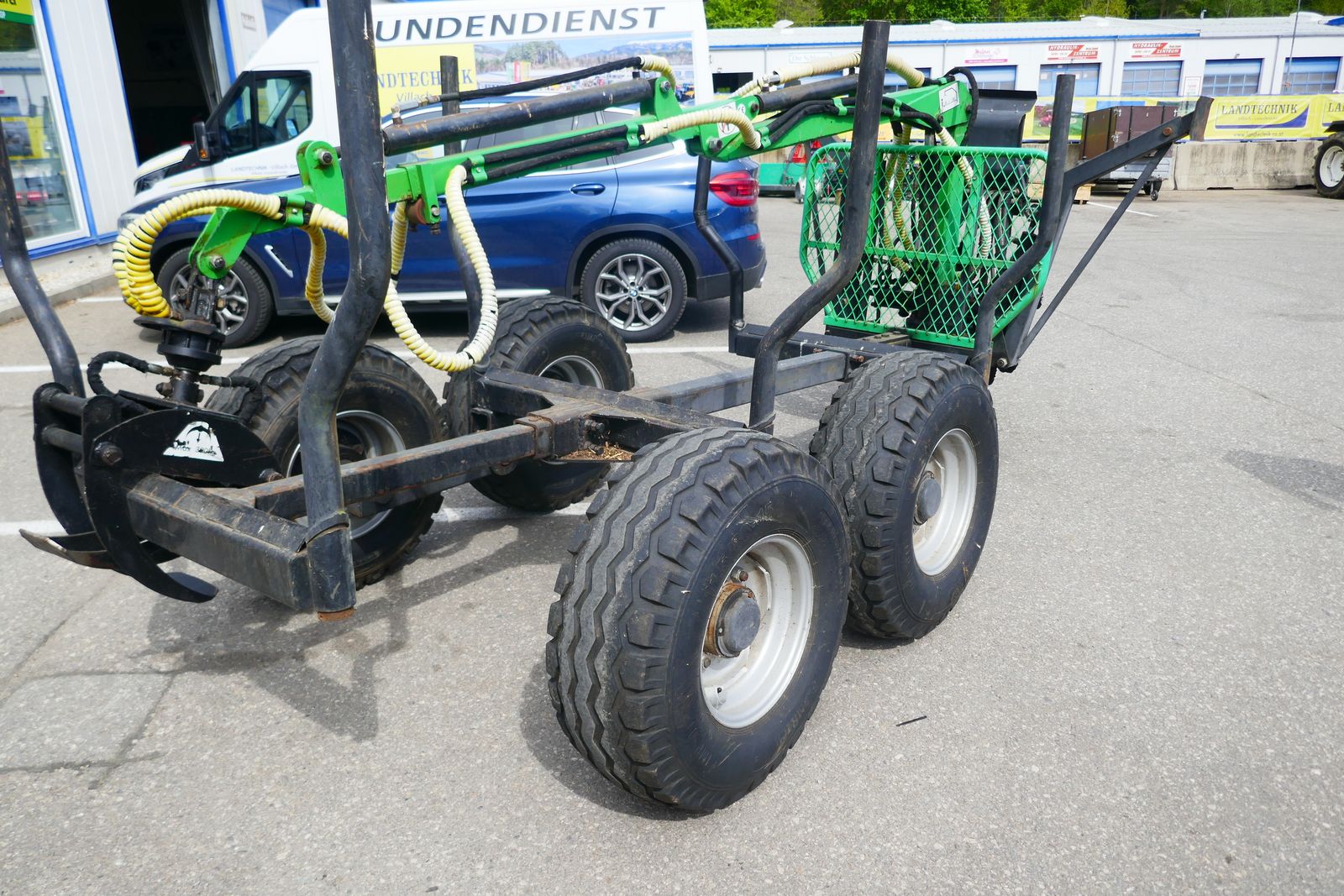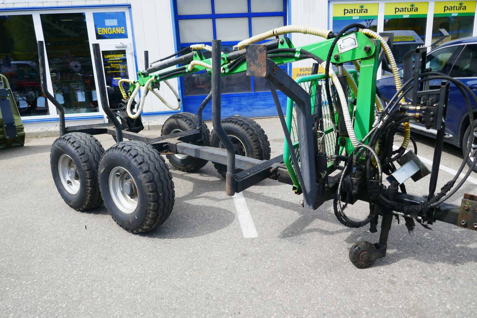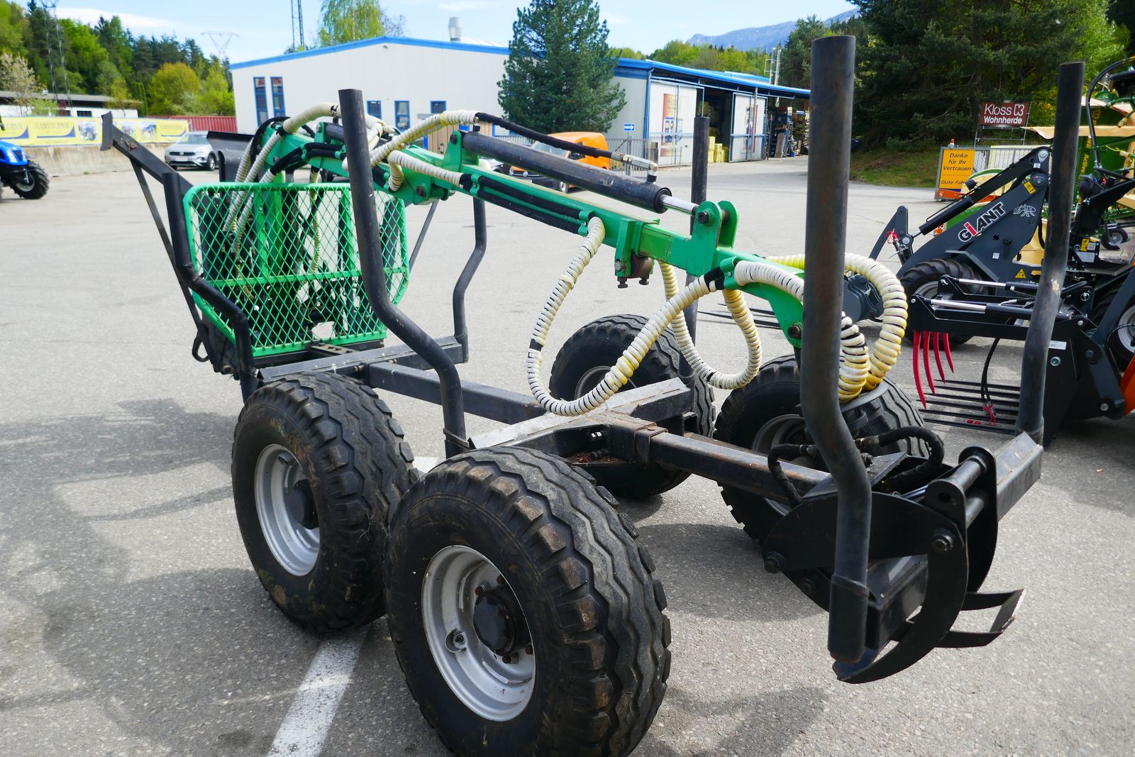 Forstanhänger 2 t leichte Ausführung mit Tandemachse, 3 Rungenpaare, Kran mit Teleskopausschub ca. 4 m und Rotator und Holzzange, mit hydraulischen Flapdown Abstützung, 1 EW Steuergerät und Druckloser Rücklauf erforderlich, ideales Fahrzeug für kleine Traktoren, Stützrad, Standort: Lieserbrücke, prompt verfügbar.